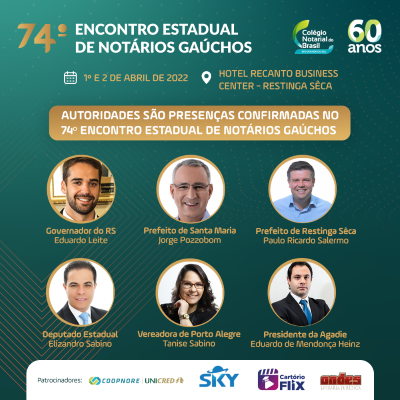 23/03/2022Autoridades são presenças confirmadas no 74º Encontro Estadual de Notários Gaúchos Autoridades são presenças confirmadas no 74º Encontro Estadual de Notários Gaúchos Leia mais...